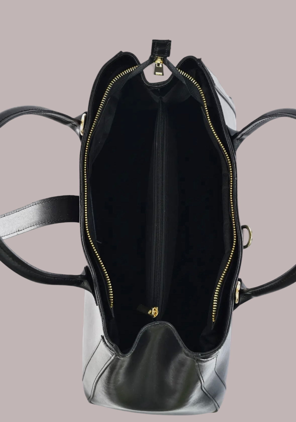 Crafted in Italy from brushed genuine leather, the Chloe Bag combines refined style with practical organization. Its smart interior offers two spacious main compartments separated by a central zippered pocket, ideal for securely storing essentials. The rear compartment includes dual side pockets suitable for documents or a phone, while the front compartment features an additional zippered side pocket, keeping your belongings neatly arranged. Black-colored accessories provide a sleek contrast, enhancing the bag’s sophisticated design for everyday elegance.